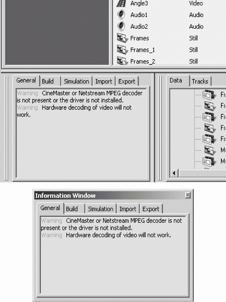 Информационное окно, которое может быть встроено в главное окно или отображаться как отдельное плавающее окно, показывает сообщения о состоянии и возникших ошибках при выполнении разнообразных операций в программе Scenarist. В этом окне есть пять закладок, на каждой из которых отображаются сообщения соответствующей категории (рис. 1.8).