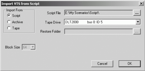 Для импорта VTS из файла скрипта, архива или ленты DLT нужно в редакторе сценариев выполнить команду меню Export ? Import VTS (Экспорт ? Импорт VTS), что приведет к отображению диалогового окна импорта VTS. Впрочем, можно также щелкнуть правой кнопкой мыши на области авторинга и в контекстном меню выполнить команду Import VTS (Импорт VTS). Это тоже позволит активировать диалоговое окно импорта VTS (рис. 3.24).