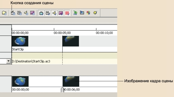После этого следует выполнить команду меню New ? New Scene (Новый ? Новая сцена) или нажать кнопку New Scene (Новая сцена) на панели инструментов. Сцена будет добавлена к дорожке и отображена как стилизованное изображение кадра видеопотока в точке создания сцены (см. рис. В.8 на цветной вклейке).