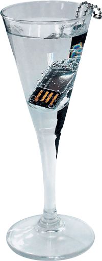 Влагозащищенный USB-накопитель. Миниатюрный, изящный, на цепочке… Этот аксессуар можно опустить в рюмку с водой и оставить там на долгое время. Такая «флэшка» способна выживать, будучи облитой жидкостью. Это важно, учитывая, что на USB-накопителях порой хранится информация деликатного свойства, потеря которой может привести к большим проблемам. Емкость накопителя 4 Гбайт, корпус – хромированный. www.supertalent.ru