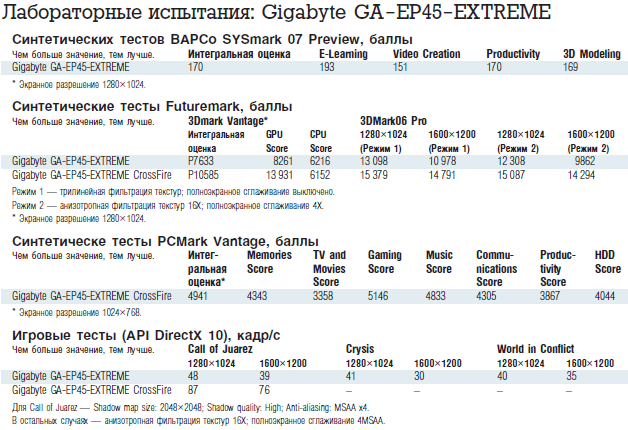 Об истинном потенциале GA-EP45-EXTREME лучше всего говорят результаты проведенного экспресс-тестирования. Кроме системной платы, основу тестового стенда оставили 3-ГГц процессор Intel Core 2 Duo E8400, модули ОЗУ DDR2-1066 SDRAM (суммарный объем 2 Гбайт, двухканальный режим работы) и графическая плата Gigabyte GV-R487-512H-B. Все испытания проводились под управлением 32-разрядной ОС Windows Vista Ultimate, которая устанавливалась на 1-Тбайт жесткий диск SATA II семейства Barracuda 7200.11 компании Seagate Technology. В указанной конфигурации платформа показала весьма достойный результат на ключевом тесте SYSmark 2007 (версия Preview, обновление 1.04.670) – 170 баллов.