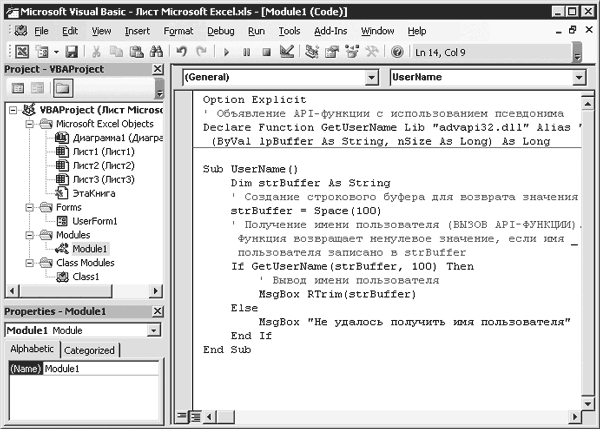 В редакторе открыты три окна: слева вверху – окно структуры проекта (Project), слева внизу – окно свойств (Properties) и справа – окно с текстом программы модуля. С помощью окна Project (Проект) можно просматривать структуру проекта, добавлять и удалять элементы проекта, открывать для редактирования содержимое модуля (двойным щелчком на значке соответствующего модуля). Окно Properties (Свойства) используется для задания свойств выделенных элементов проекта.