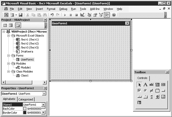 Для изменения свойств открытой формы используется окно Properties (Свойства). В окне ТооШох (Панель инструментов) можно выбирать элементы управления, добавляемые в форму. После добавления любого элемента управленияс помощью двойнго щелчка кнопкой мыши на нем можно перейти к редактированию соответствующего кода в модуле формы.
