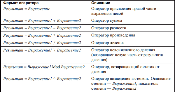 Информация обо всех операторах для работы с численными значениями приведена в табл. 1.3.