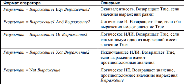 В VBA введены операторы, которые используются в составе логических выражений (например, условие в инструкции If-Then-Else, которая будет рассмотрена позже). Формат логических операторов VBA (кроме импликации) и их описание приведены в табл. 1.6 (все выражения, используемые в операторах, – логические, принимающие значение True или False).