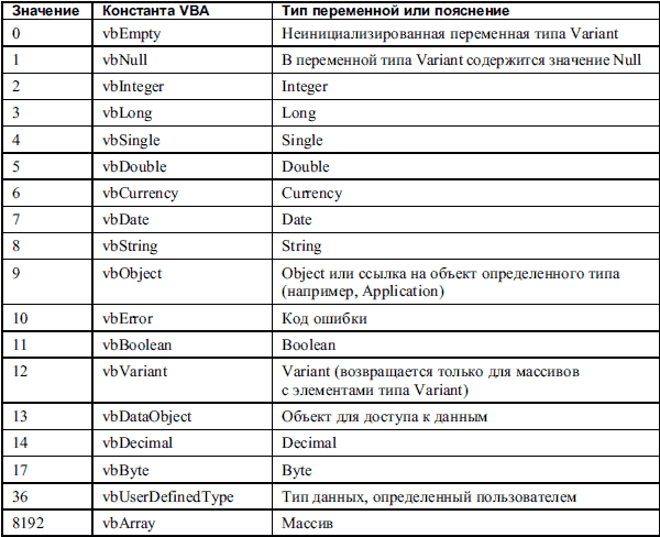 1. Для идентификации встроенного в VBA типа можно использовать функцию VarType. В качестве аргумента она принимает идентификатор переменной или константное значение некоторого типа. Возвращаемые этой функцией значения и их расшифровка приведены в табл. 1.8.