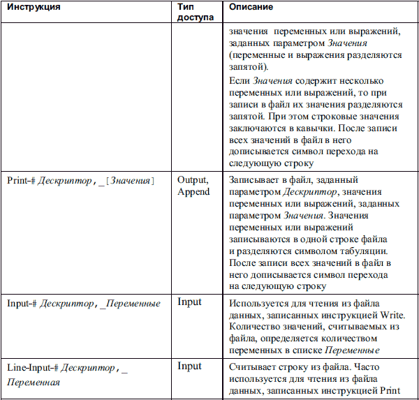 Описание инструкций последовательного доступа, используемых для работы с файлами, приведено в табл. 1.11.