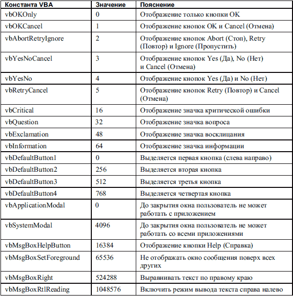 Особого рассмотрения заслуживает аргумент Стиль – он задает значок окна сообщения, отображаемые в этом окне кнопки и другие полезные параметры стиля окна. В табл. 1.12 приведено описание значений, которые объединяются при задании аргумента Стиль с помощью оператора Or.