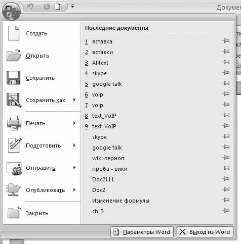 После набора нескольких абзацев текста обязательно сохраните их. Для этого нажмите кнопку Office и выберите в появившемся меню пункт Сохранить (рис. 2.4). В окне Сохранение документа необходимо указать имя и выбрать месторасположение файла в поле Папка (по умолчанию файл сохраняется в папку Мои документы). При сохранении рекомендуется присваивать файлу имя, по которому можно быстро идентифицировать документ.