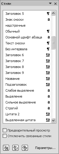 Список доступных для применения стилей расположен в диалоговом окне группы Стили. Чтобы убедиться, что здесь отображены все доступные стили редактора Word, нажмите кнопку Параметры (рис. 2.8).