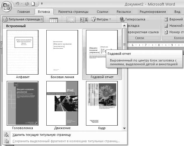 После сохранения созданной обложки вы сможете вставлять ее в документ, нажав кнопку Титульная страница вкладки Вставка. Внизу появившейся галереи вы увидите добавленную вами титульную страницу.