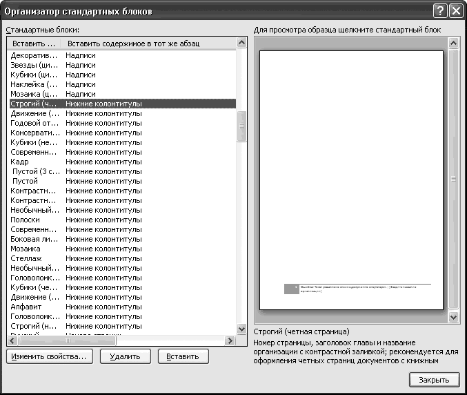 Кроме галереи для элементов одного типа, в текстовом редакторе существует общая галерея стандартных блоков. Чтобы ее просмотреть, на вкладке Вставка в группе Текст нажмите кнопку Экспресс-блоки и в появившемся меню выберите пункт Организатор стандартных блоков. Вы увидите на экране окно с общим списком блоков (рис. 2.11).