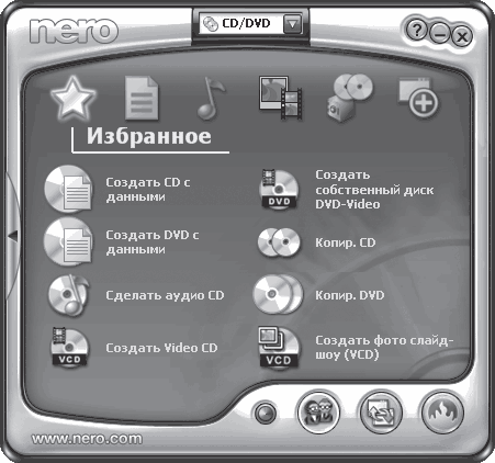 • Избранное – здесь находятся ссылки на наиболее часто используемые функции, такие как создание дисков с данными, копирование дисков, создание DVD и аудио CD;