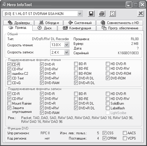 • Дополнения – здесь находятся ссылки на все дополнительные утилиты, позволяющие стереть перезаписываемый CD/DVD, получить информацию о возможностях привода и системе (рис. 2.3), протестировать привод, сделать этикетку на диск, принудительно установить скорость привода, смонтировать образ диска.