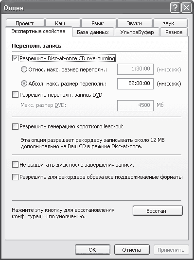 Устанавливаем флажок Разрешить Disk-at-once CD overburning, если планируется прожиг CD, или флажок Разрешить переполи. Запись DVD в случае использования DVD. После этого активируются пункты, в которых необходимо указать объем информации на будущем диске, причем для CD перепрожиг указывается в минутах и секундах, а для DVD – в мегабайтах. Для CD можно также указать как абсолютный размер, так и относительный, то есть на сколько минут разрешено превышать объем диска. Обычно все, особенно качественные, заготовки корректно переносят небольшой перепрожиг, поэтому можно сразу разрешить перепрожиг на одну-две минуты. В случае возникновения проблем можно вернуться к исходным установкам, нажав кнопку Восстан., расположеную внизу окна. Установка флажка Разрешить генерацию короткого Lead-out, расположеного на этой вкладке, разрешит записывать короткую дорожку, закрывающую диск, вместо стандартной, занимающей 90 секунд, что высвободит еще 12 Мбайт дополнительного места.