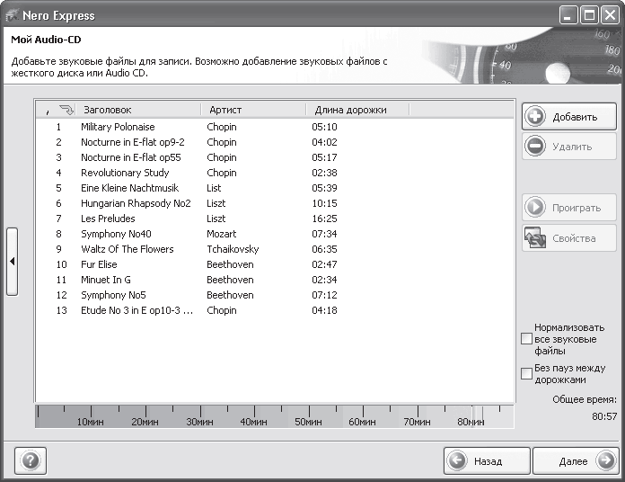 Сегодняшние бытовые проигрыватели воспроизводят музыкальные файлы во многих форматах; по причине наибольшей распространенности самым популярным из них является формат MP3. Для прослушивания музыки в этом формате достаточно создать диск с данными и поместить на него файлы с расширением MP3. Компьютер воспроизведет файлы, записанные на таком диске, однако некоторая аппаратура (особенно это касается уже устаревших образцов) поддерживает только стандарт Audio CD (CD-DA), поэтому, несмотря на то что музыки в MP3 на диск помещается больше, иногда возникает необходимость записи дисков в формате Audio CD. Nero позволяет создавать такие диски, обеспечивая «на лету» перекодировку музыкальных файлов нескольких форматов, среди которых MP3, OGG, WMA, CDA, АСЗ, AIFF, WAV, AAC, МР4 (рис. 2.5).