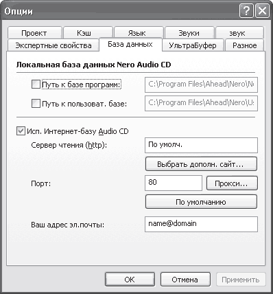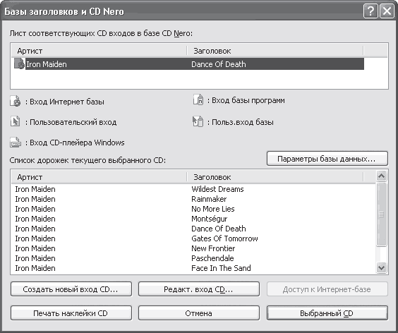 При необходимости перед записью на диск музыкальные файлы можно отредактировать (удалить лишнее, добавить эффекты, улучшить качество) в Nero WaveEditor. Необходимо также отметить, что, кроме записи Audio CD, Nero дает возможность преобразовывать такие диски или аудиофайлы в различные форматы, а также перекодировать файлы, содержащиеся на Audio CD, в один из указаных выше форматов. Последнее может понадобиться при необходимости воспроизводить музыку на переносном проигрывателе вроде популярных сейчас flash USB. Перекодировать Audio CD очень просто: вставляем диск в привод, запускаем Nero SmartStart, выполняем команду Звук ? Преобразовать Audio CD в звуковые файлы. Появится запрос с предложением получить информацию об артисте и заголовке из базы данных Nero или Интернета. Это весьма полезная функция, так как при ее использовании не нужно будет вручную заполнять ID3-теги, в которые эта информация записывается, а затем выводится в окне проигрывателя. Перед соединением с Интернетом следует сначала настроить параметры соединения, для чего выполняем команду Опции ? База данных (рис. 2.6) и устанавливаем флажок Исп. Интернет-базу Audio-CD. Нажав кнопку Выбрать дополн. сайт, можно выбрать из списка дополнительный сайт для получения информации. После соединения с базой данных появится окно, содержащее список песен, название альбома и композиций (рис. 2.7).