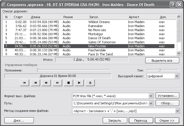 В поле Путь указываем каталог, в который будут скопированы перекодированные файлы. Формат имени будущего файла задается в поле Метод создания имени файла. Теперь, когда все готово, выбираем нужные дорожки и нажимаем кнопку Переход. По истечении некоторого времени в выбраном каталоге появятся требуемые музыкальные файлы.