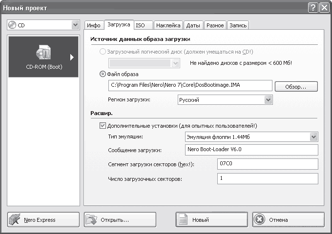 Параметр для создания загрузочного CD появляется только в расширенном режиме SmartStart. При этом запускается Nero Burning ROM, а в параметрах проекта к стандартным добавляется вкладка Загрузка. Процесс создания загрузочного диска с помощью Nero Burning Rom показан в видеоролике «Урок 2.5. Создание загрузочного диска». Необходимо отметить, что в простейшем случае такой диск создается не труднее записи диска с данными. Разработчики Nero подготовили загрузочный образ – файл DosBootimage. IMA (С:Program FilesNeroNero 7Соге) (рис. 2.9).