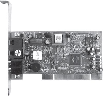 Модемы бывают двух типов: внешние (рис. 4.11) и внутренние (рис. 4.12). Внутренние представляют собой плату расширения, которую обычно устанавливают в PCI-слот. Внешний же модем может подключаться к компьютеру через LPT-, СОМ-, USB-порт или вход сетевой карты.