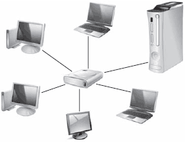 При этой топологии все компьютеры (каждый своим кабелем) подключаются к некоторому сетевому устройству, например концентратору. Подобное подключение напоминает звезду (рис. 6.2), этим и объясняется название. Подобная топология находит свое применение в сетях на основе витой пары.