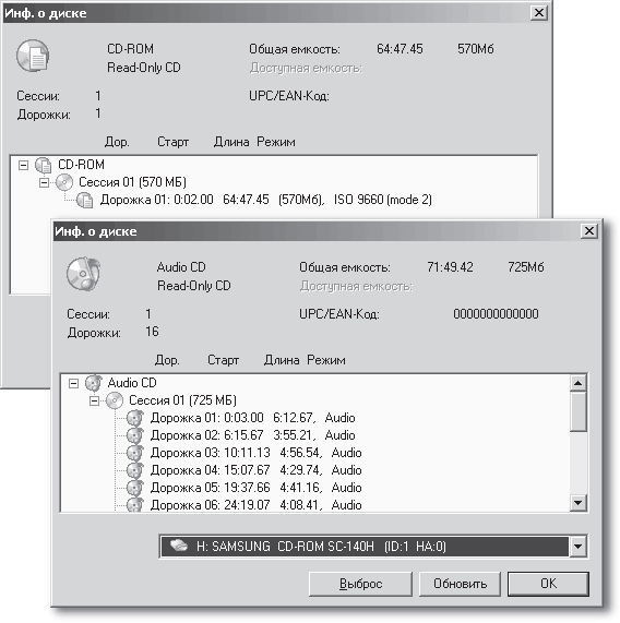 Однако количество дорожек внутри сессии определяется пользователем и особенностями записываемых данных. Как правило, если на диск записываются «обычные» файлы (данные или программы, втом числе игры), создается единственная дорожка. При записи аудиодисков число дорожек обычно равно числу записываемых аудиофайлов (подробнее особенности создания аудиодисков рассмотрены в следующем разделе).