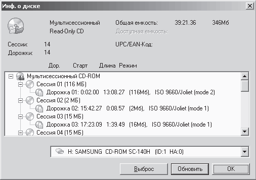 Одна операция записи на диск (то есть период времени от включения до выключения лазера) обычно называется сессией (Session). Другими словами, сессия – это набор данных (фонограмм, файлов и папок), помещенных на диск за одну операцию записи. Каждая сессия может содержать одну или несколько дорожек. Количество дорожек задается пользователем в зависимости от характера записываемых данных.