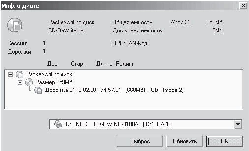 До тех пор пока на компакт-диске используется пакетный режим, все операции записи считаются относящимися к одной сессии. Кроме того, программы, «не понимающие» режим Packet Writing, считают все отформатированное пространство диска занятым данными (рис. 1.4).