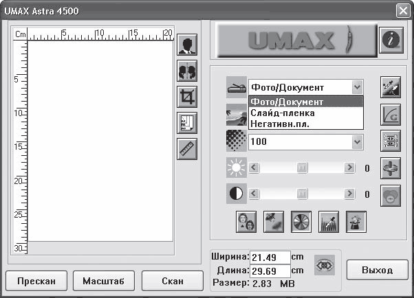 Для начала необходимо определить материал, на котором выполнено исходное изображение: фотография, слайд или негативная пленка, а затем выбрать нужное из раскрывающегося списка (рис. 1.11).