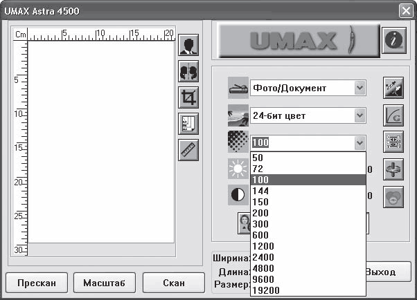 На рис. 1.12 представлен список режимов сканирования изображения, предлагаемых сканером UMAX Astra 4500.