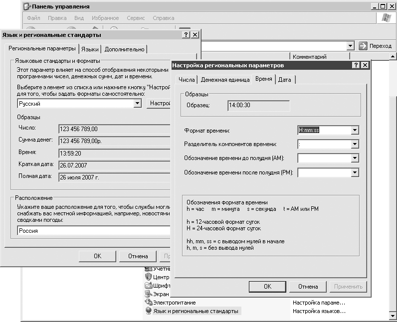 Настройки о формате времени задаются при установке Windows, но и сейчас их можно исправить. Откройте Панель управления, дважды щелкните на значке Язык и региональные стандарты, перейдите на вкладку Региональные параметры, нажмите кнопку Настройка, откройте вкладку Время (рис. 3.10). В раскрывающемся меню Формат времени выберите либо значение H:mm:ss (без вывода нулей вначале) либо HH:mm:ss (с выводом нулей в начале).