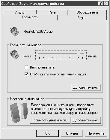 Откройте Панель управления, запустите компонент Звуки и аудиоустройства. Откроется окно (рис. 3.17). Установите флажок Отображать значок на панели задач и обязательно снимите флажок Выключить звук. Теперь возле часов должен появиться регулятор громкости – им пользоваться гораздо удобнее.