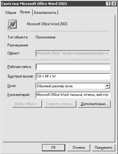 Кстати, для запуска утилиты, ярлык которой размещен на Рабочем столе, вы можете использовать сочетания клавиш. К примеру, если был создан ярлык на программу Microsoft Word, щелкните на этом ярлыке правой кнопкой мыши и в открывшемся меню выберите команду Свойства. Переместите курсор в строку Быстрый вызов. Нажмите и удерживайте клавиши Ctrl и Alt – в строке появятся символы Ctrl+Alt+ (рис. 3.18). Не отпуская указанных клавиш, нажмите еще одну на буквенной клавиатуре, например W. В результате в строке Быстрый вызов появится следующее: Ctrl+Alt+W. Это означает, что нажав одновременно клавишу Ctrl, клавишу Alt и клавишу W, вы запустите программу, на которую данный ярлык ссылается. В данном случае это Microsoft Word.