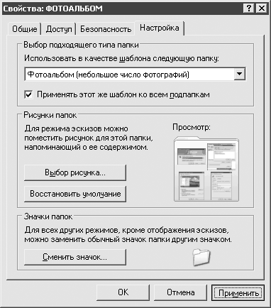 • Щелкните на созданной папке правой кнопкой мыши и в открывшемся меню выберите команду Свойства. В открывшемся окне перейдите на вкладку Настройка, под строкой Использовать в качестве шаблона следующую папку выберите пункт Фотоальбом и установите флажок Применять этот же шаблон ко всем подпапкам (рис. 4.4).