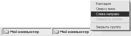 Для начала запустите два экземпляра Проводника Windows. Если на Панели задач Windows кнопки для этих двух окон объединены в одну с надписью типа 2 Windows Explorer или 2 Мой компьютер, просто щелкните на такой кнопке правой кнопкой мыши и в открывшемся меню выберите команду Слева направо. Если же каждое из окон представлено на Панели задач отдельной кнопкой, сделайте следующее.