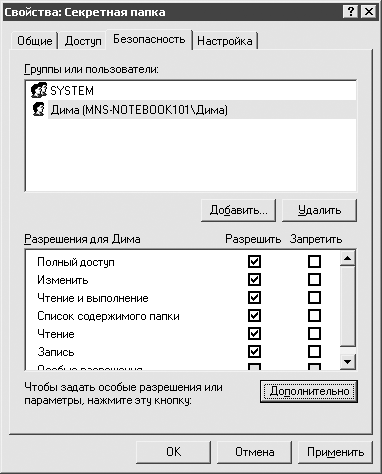 Нажмите кнопку Добавить, откроется окно Выбор: Пользователи или группы. Нажмите сначала кнопку Дополнительно, а затем кнопку Поиск. В списке выберите имя своей учетной записи и нажмите OK. Теперь в разделе Группы и пользователи появилось ваше имя пользователя. Учетная запись системы (называется SYSTEM либо СИСТЕМА), скорее всего, тоже там есть. От остальных записей следует избавится с помощью кнопки Удалить. Только не забудьте дать своей учетной записи полные права доступа к искомой папке: выберите свое имя пользователя в разделе Группы и пользователи и в нижней части окна установите флажок Полный доступ в столбце Разрешить. Внимание: не перепутайте столбцы Разрешить и Запретить, иначе вы сами не сможете получить доступ к своей папке.