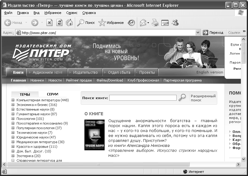 Подключиться к Интернету – только полдела. Для путешествий по Глобальной сети понадобится браузер – программа, позволяющая совершать просмотр веб-страниц, переход по ним, их сохранение и пр. Например, в состав операционных систем семейства Windows входит встроенный браузер Internet Explorer (рис. 1.2), который сегодня является самым популярным в силу распространенности операционной системы Windows. Чтобы запустить Internet Explorer, нужно выполнить команду Пуск ? Все программы ? Internet Explorer.