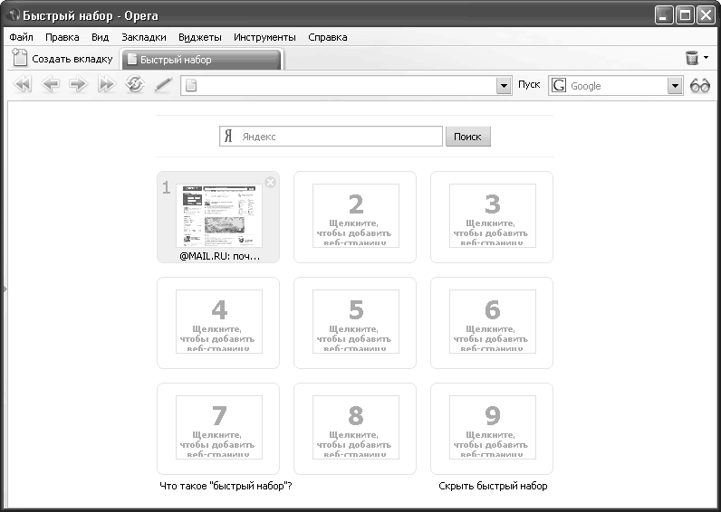 • Быстрый набор – некое подобие закладок, но выполненное более удобно и наглядно и работающее независимо от самих закладок. Функция Быстрый набор (рис. 1.8) появилась в Opera начиная с версии 9.2. При запуске браузера появляется окно с девятью большими кнопками, каждой из которых можно назначить вызов той или иной страницы, при этом на кнопке появится миниатюрное изображение этой страницы.