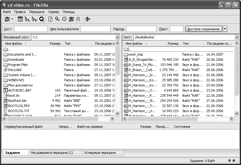 Как видно из рисунка, FTP-клиент чем-то напоминает файловый менеджер или, если хотите, Проводник Windows, только в левой части его окна отображается содержимое дисков компьютера, а в правой – каталоги FTP-сервера. Работа с программой предельно проста: чтобы загрузить файл на компьютер, достаточно перетащить его с помощью мыши из правой части окна в левую, и начнется процесс загрузки. Чтобы выгрузить файл со своего компьютера на FTP-сервер, нужно соответственно произвести обратное действие.