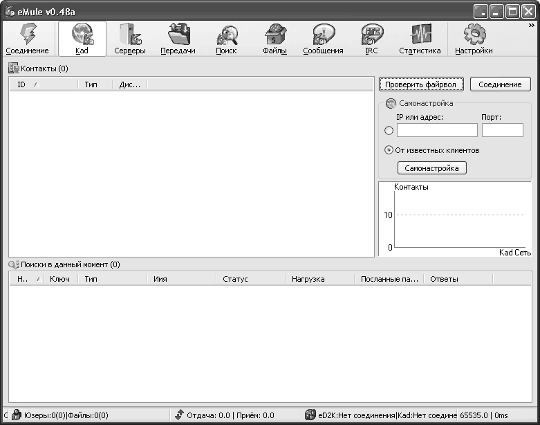 Данная программа универсальна, ориентирована на самые разные типы загружаемых файлов и расположена по адресу http://www.emule-project.net/. Имеет дружественный русскоязычный интерфейс. Недостаток eMule – очередь на закачку файлов, вследствие чего приходится подолгу просиживать «впустую» в ожидании своей очереди. Суть этой очереди в следующем: каждый получает очки, отдавая свои файлы другим пользователям. Чем больше очков, тем быстрее можно продвинуться в очереди на загрузку файла. Благодаря широкой распространенности поддерживаемых файлообменных сетей eDonkey и Kademlia клиент eMule (рис. 2.8) позволяет находить достаточно редкие файлы. В программе внедрена функция MobileMule, позволяющая контролировать работу приложения посредством мобильного телефона, можно также управлять программой с удаленного компьютера.