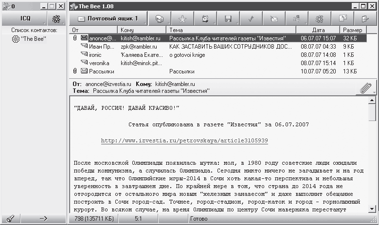 Рис. 1.8. Окно программы The Bee с загруженными письмами и панелью ICQ