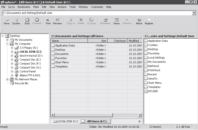 Xplorer2 – это не классический менеджер с двухпанельным интерфейсом, как остальные программы данного раздела. Это скорее доработанная версия Проводника. На это указывает его название, это можно понять по его внешнему виду. Программа имеет не две, а три панели просмотра (рис. 2.12). В первой отображается дерево каталогов, а две другие позволяют работать с файлами. Получается своеобразный гибрид Проводника и двухпанельного менеджера.
