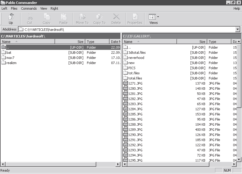 Данный бесплатный файловый менеджер (рис. 2.18) представляет собой нечто среднее между Проводником и Norton Commander. Программа имеет две панели просмотра и поддерживает все горячие клавиши для управления файлами, знакомые пользователям Norton Commander. В то же время Pablo Commander полностью поддерживает использование контекстных меню и метод перетаскивания, как в Проводнике. Среди других возможностей программы можно отметить сравнение содержимого двух папок и встроенный FTP-клиент.