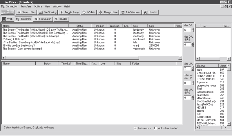 Рис. 2.24. Окно передачи/приема файлов в программе SoulSeek