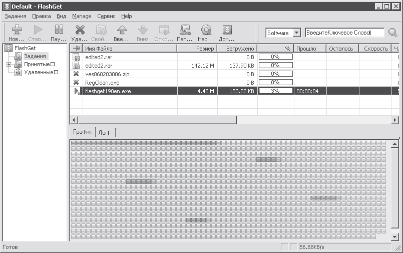 По умолчанию FlashGet разбивает файл на пять частей, но это количество можно изменить. Программа также позволяет просматривать содержимое HTTP– и FTP-серверов, а также создавать неограниченное количество тематических категорий, в которых для облегчения поиска могут располагаться задания на загрузку (рис. 2.28).