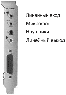 Теперь поговорим немного подробнее об аналоговом захвате звука. Чаще всего устройства захвата позволяют вместе с видео захватывать и звук. Однако если, например, используется плата захвата Pinnacle Studio 500-PCI, то невозможно подсоединить камеру к S-Video разъему, и в нашем распоряжении остается только видеовход (нет разъемов для подключения аудиокабелей). В таком случае поможет вход звуковой карты компьютера. Внешний вид планки с разъемами типичной звуковой карты приведен на рис. 2.16.