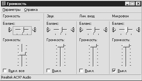 Затем нужно убедиться, что в появившемся окне не отключен и не уменьшен до предела общий уровень звука (регулятор Громкость на рис. 2.18). После этого следует проверить, не выключен ли линейный вход (Лин. вход) и не уменьшена ли до предела громкость.