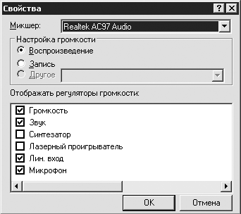 Если вы открыли регулятор громкости и не увидели упоминаемые выше регуляторы Громкость и Лин. вход, то, скорее всего, их отображение просто отключено. Чтобы данные регуляторы отображались, воспользуйтесь настройками окна Свойства (рис. 2.19), вызываемого командой меню Параметры ? Свойства регулятора громкости.