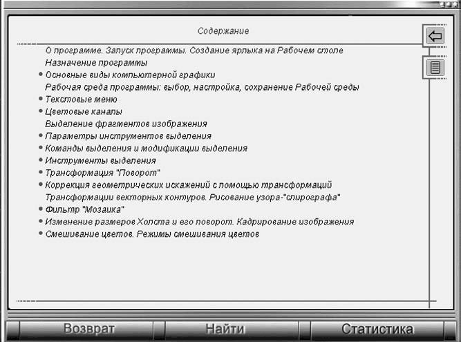 Обратите внимание на служебные кнопки Возврат (для возврата на предыдущий уровень), Найти (для перехода к системе поиска), а также на кнопки навигации в верхнем правом углу экрана.
