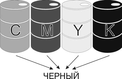 Итак, модель CMYK содержит четыре цвета. Их интенсивность измеряется в процентах. Если интенсивность каждого цвета равна нулю, на конечный носитель, например лист бумаги, точка не печатается. В данном случае результирующий цвет будет соответствовать исходному цвету бумаги. Для простоты предположим, что мы имеем дело с белой бумагой. Итак, интенсивность всех четырех цветов рана нулю – бумага белая. Если интенсивность бирюзового, пурпурного и желтого цветов будет равна 100, то принтер (или типографское оборудование) наносит все три цвета в максимальном количестве на одну точку. Теоретически это должно привести к черному цвету. Однако на практике этого добиться не удается: все зависит от качества и оттенка бумаги, качества чернил и других факторов. В результате цвет получается близким к черному, но с явными оттенками. По этой причине в данную модель был введен ключевой цвет Key, который предназначен для добавления черных точек в изображение (рис. 1.2). В вашем цветном принтере тоже есть черный картридж. Без ключевого цвета изображения получаются слишком блеклыми, неконтрастными.